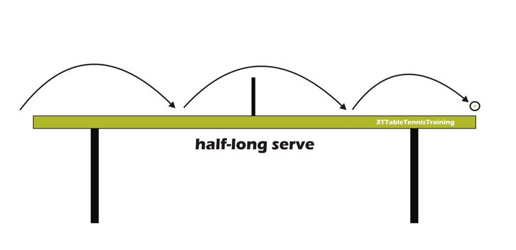 Abschließend wollen wir noch den halb-langen Aufschlag (Schaubild 3) vorstellen. Dabei findet der zweite Aufsprung auf der gegnerischen Tischhälfte am Tischende oder ganz knapp danach statt. Aufgrund dieser Nähe zur Tischkante und der dadurch gegebenen Kollisionsgefahr zwischen Schläger und Tisch ist es für den Gegner schwierig, einen halb-langen Aufschlag fest anzugreifen. Die Aufschlaglänge zwingt den Gegner zu einer schnellen Entscheidung, ob ein Flip oder Topspin der richtige Rückschlag ist. Oft passieren bei dieser Entscheidung, die in Sekundenbruchteilen erfolgen muss, einfache Fehler beim Rückschlag. Wird der halb-lange Aufschlag vom Gegner attackiert, ist dieser Rückschlag aufgrund der Kollisionsgefahr meist nicht "tödlich" und kann von mit einem knackigen Schuss oder Gegentopsspin übernommen werden.
