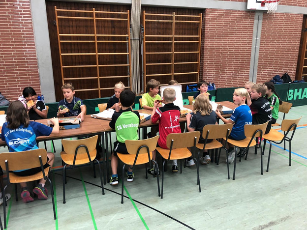 Nach der Mittagspause mit Pizzaessen stand ein sportmotorischer Test auf dem Plan, zu dem Koordination, Schnelligkeit, Sprungkraft und ein Rotationstest gehörten. Im Anschluss wurden noch wettkampfnahe Übungen und Wettkampf selber gespielt.