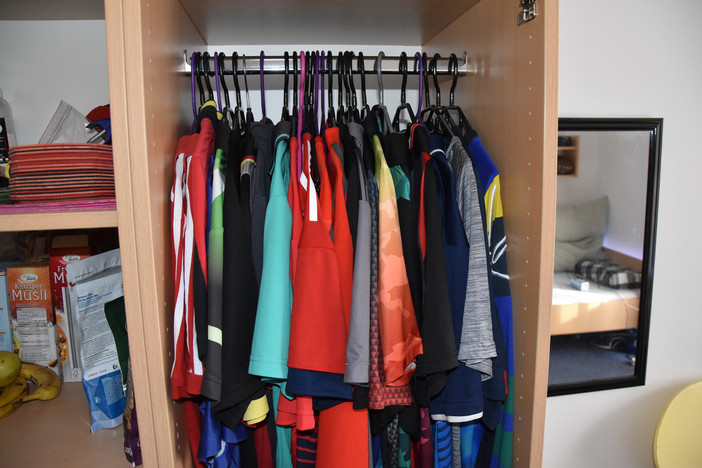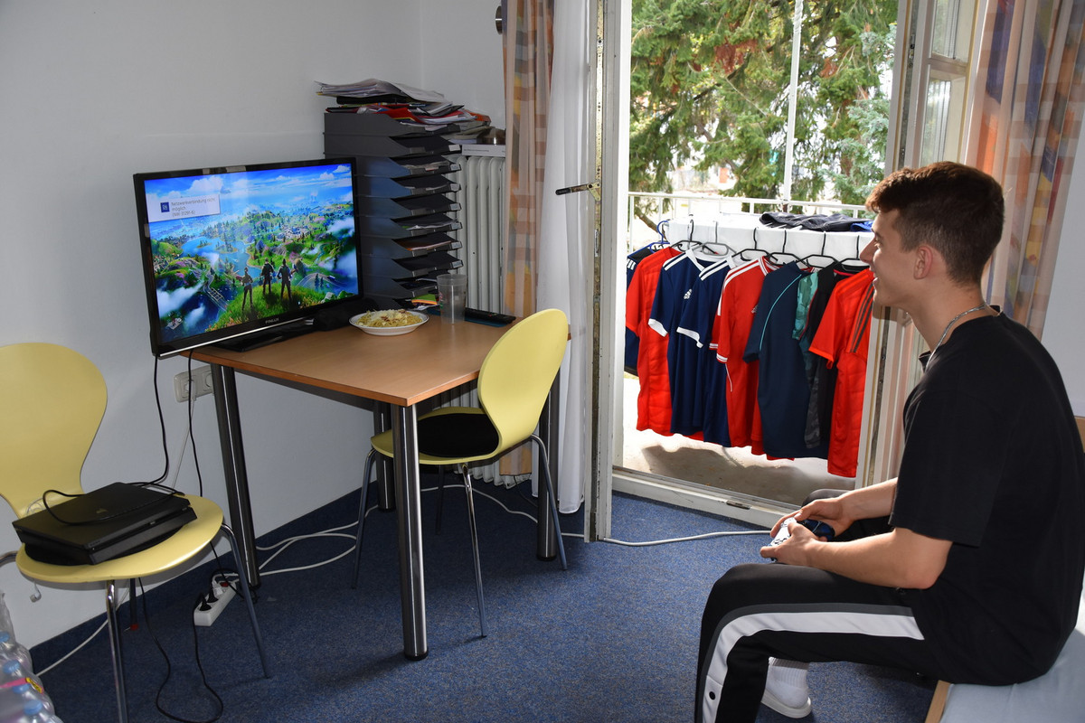 Einer von ihnen ist Max Keller, vor drei Monaten verließ der 14-Jährige seine Heimat Lautertal bei Coburg, um sich in München weiterzuentwickeln. Keller sitzt gerade an seinen Hausaufgaben, gleich geht es zum nächsten Training. Am Morgen hat er bereits vor der Schule eine anderthalbstündige Einheit hinter sich gebracht. Seine Familie sieht er meist nur noch am Wochenende, wenn er mal frei oder bei seinem Verein TSV Bad Königshofen ein Punktspiel hat. „Es läuft gut hier, man gewöhnt sich an die Abläufe. Mir ist es schwergefallen, gerade in der Schule alles selbstständig zu machen, weil man niemanden kennt. Aber die anderen Jungs, die schon länger da sind, helfen mir, wo es nur geht“, sagt der 14-Jährige. Nicht selten sitzt die ganze Gruppe abends nach dem Training beim Essen im Speisesaal des HdA zusammen. Auch der Austausch mit den anderen Sportlern sei gut. Daniel Rinderer: „Es sind Volleyballer, Judoka, Schwimmer, Leichtathleten da, wir sind eine coole Gruppe.“ Die Schüler wohnen in Einzel- oder Doppelzimmern, mit Küchenzeile und Einzelbett. Dass es allesamt Sportler sind, sieht man auf den ersten Blick. Sauber aufgereiht liegen die Trikots von Nico Longhino (FC Bayern München) im Schrank, mindestens 20 Stück. Am Wäscheständer auf dem kleinen Balkon seines Einzelzimmers hängen noch mal zehn. Nico Longhino sitzt auf dem Bett und spielt auf der Konsole – eine kurze Pause zwischen Schule und dem nächsten Training.