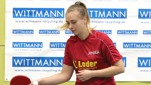 Ohne Edel-Teilzeitkraft Krisztina Toth zeigte sich selbst der unangefochtene Tabellenführer Kolbermoor II verwundbar: Bundesliga-Neuling DJK SB Landshut schaffte im Bayernderby ein 5:5-Unentschieden und sorgte damit für dessen erst zweiten Punktverlust der laufenden Saison. Das Hinspiel mit Toth hatte Kolbermoor 6:0 gewonnen. Diesmal ging es nach Punkteteilung in den Doppeln in den Einzeln in Zweierschritten hin und her. Vorne holten die beiden Ungarinnen Fanni Harasztovich und Mirella Madacki (Foto) aus engen Gefechten mit den DTTB-Nachwuchsnationalspielerinnen Naomi Pranjkovic und Laura Kaim volle Punktzahl für die Gäste aus Landshut. Die Hausherrinnen „konterten“ hinten durch Doppelpacks von Iana Zhmudenko und Ugne Baskutyte aus den Vergleichen mit Katharina Teufl und Katharina Auer.