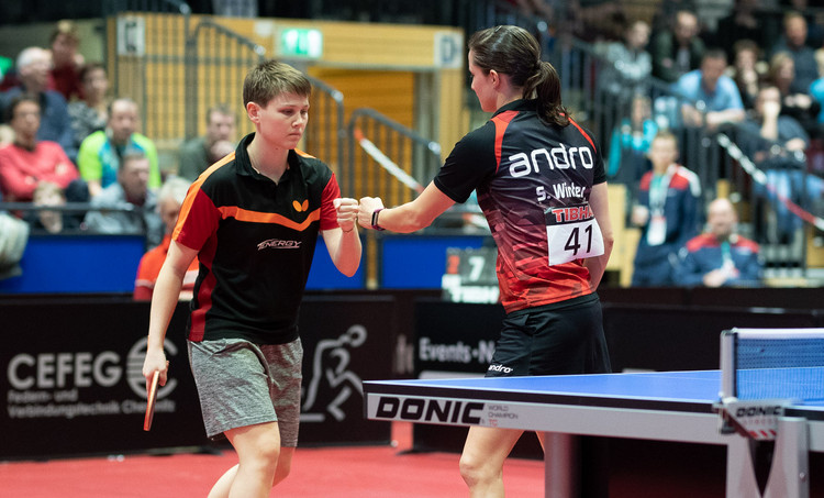 Einmal Gold, zweimal Silber, fünfmal Bronze: Das ist die bayerische Medaillen-Bilanz bei den 88. Deutschen Meisterschaften in Chemnitz. Für den einizgen Titel sorgte Sabine Winter. Die 27-Jährige aus Hechendorf in Oberbayern kann man getrost als Doppel-Queen bezeichnen. In Chemnitz gewann die Nationalspielerin vom TSV Schwabhausen nach 2018, 2015, 2013 und 2010 ihren bereits fünften deutschen Meistertitel, mit der vierten Partnerin. Im Endspiel besiegten Winter und Nina Mittelham - die beiden hatten sich im Einzel-Halbfinale gegenübergestanden (4:2 für Mittelham) - die Routiniers Tanja Krämer und Jessica Göbel (Busenbach) mit 3:1. Mittelham hatte 2019 in Wetzlar zusammen mit Franziska Schreiner (TV Hofstetten) den Titel geholt. Die beiden Siegerinnen vom Vorjahr trafen diesmal im Halbfinale aufeinander, wo Winter/Mittelham mit 3:1 über Schreiner/Tsutsui triumphierten. "Ich bin sehr happy, dass wir das Turnier gewonnen haben, es ist immerhin mein fünfter Titel im Doppel. Wir mussten uns natürlich anstrengen", sagte die zweifache Doppel-Europameisterin Winter gegenüber tischtennis.de.