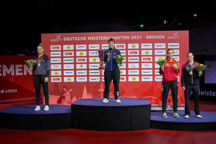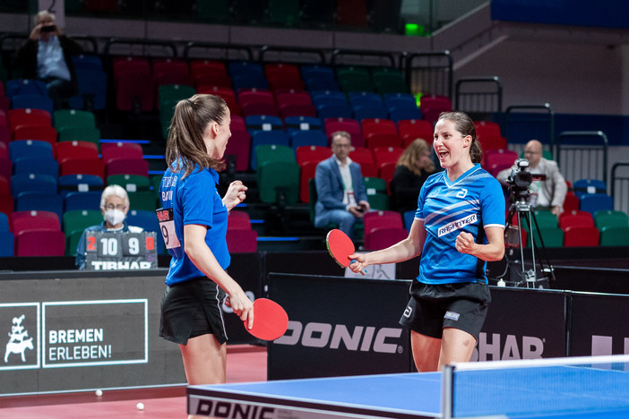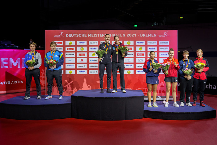 Zwei Bayerinnen standen in der ÖVB Arena am Sonntag ganz oben auf dem Podest. Sabine Winter und Laura Tiefenbrunner heißen die Deutschen Meister im Damen-Doppel. Und das absolut verdient. Auf dem Weg zum Titel gab die oberbayerische Kombination nur zwei Sätze ab. Im Finale ließ das Duo den Routiniers Tanja Krämer und Jessica Göbel keine Chance. Für Sabine Winter (TSV Schwabhausen), die zweimalige Doppel-Europameisterin, war es der sechste (!) DM-Titel im Doppel - und dies mit der fünften Partnerin. Chapeau! Und für Laura Tiefenbrunner war der Erfolg in Bremen einer der größten ihrer noch jungen Laufbahn. Die 19-Jährige vom SV DJK Kolbermoor hatte 2019 bei der Jugend-EM Gold mit Team Deutschland gewonnen. "Eine Goldmedaille bei den Deutschen Meisterschaften ist natürlich ein großer Erfolg. Das habe ich natürlich meiner Partnerin zu verdanken, dass sie mich so gut mitgezogen hat. Es hat gut harmoniert und Spaß gemacht", sagte Tiefenbrunner im Interview mit dem DTTB. Nach den Worten Tiefenbrunners musste die Doppel-Partnerin gleich einhaken: "Ich möchte anmerken, ich habe sie nicht mitgezogen, sie hat super gespielt und wir haben gemeinsam diesen Titel gewonnen", betonte Winter. Tiefenbrunner hatte Winter gefragt, ob sie mit ihr in Bremen Doppel spielen möchte. "Ich dachte mir, oh ja, das wird Spaß machen. Dass es so gut klappt, habe ich nicht erwartet. Aber dass wir gut zusammen spielen wusste ich", so Winter.