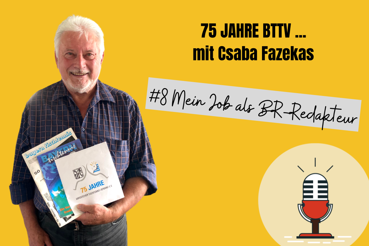 Der BTTV ist 2020 75 jahre alt geworden, wegen der Pandemie mussten alle Feierlichkeiten im letzten und in diesem Jahr abgesagt werden. Als "Ersatzprogramm" erzählt der frühere BR-Redakteur Csaba Fazekas in 9 Episoden von sportlichen Höhepunkten, großen Persönlichkeiten, spannenden Reisen und auch von seiner Arbeit beim Fernsehen. Fazekas, 77, gebürtiger Ungar, der mit seiner Frau in München-Trudering lebt, hat in seiner BR-Zeit zwischen 1969 und 2003 über Sport und insbesondere Tischtennis berichtet.