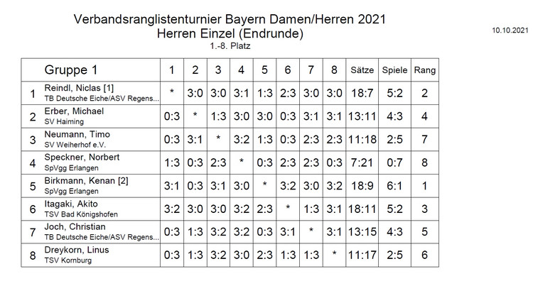 Beim Verbandsranglistenturnier 2021 der Damen und Herren, das am 08./10. Oktober in Putzbrunn stattfand, belegte Michael Erber vom SV Haiming einen guten 4. Platz, wobei er dem Sieger Kenan Birkmann (SpVgg Erlangen) die einzige Niederlage beibrachte.