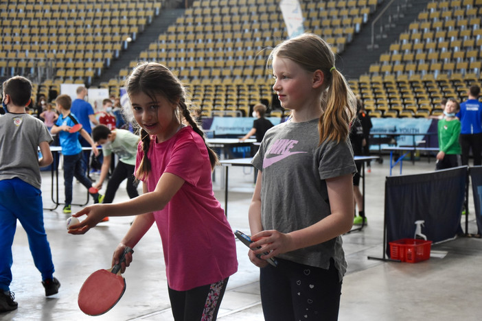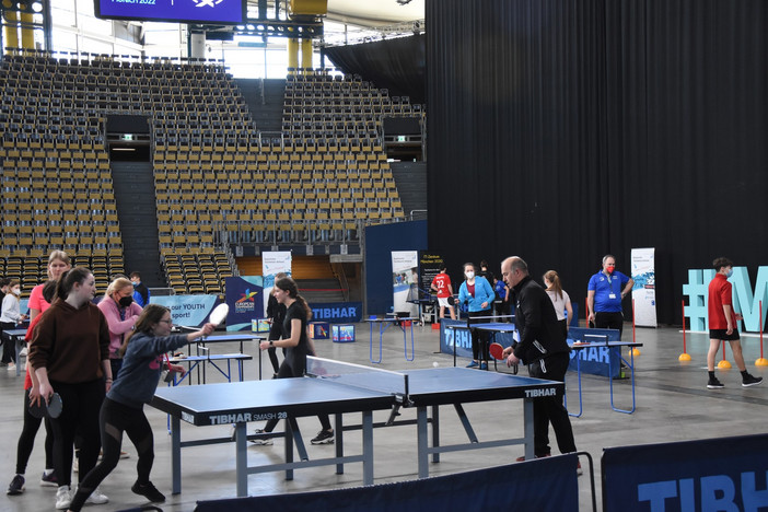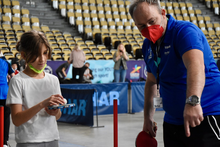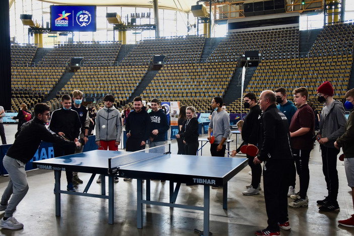 In der Olympiahalle war unter anderem der BTTV mit seinem mehrköpfigen, fleißigen Helferteam um Mitarbeiterin Petra Scherer und dem Bundesfreiwilligen Nico Longhino vertreten. Mehrere Schulklassen der Jahrgansstufen 3 bis 11 und deren Lehrkräfte konnten an ehrwürdiger Stätte Tischtennis in allen Facetten ausprobieren, gegen den Roboter antreten oder das TT-Sportabzeichen ablegen. Im Zuge der Future Class of 22 können Grundschüler (3./4. Klasse) auch an einem Mixed-Team-Turnier teilnehmen. Die Gesamt-Sieger werden im Rahmen der Europameisterschaften ermittelt und geehrt. Weitere Informationen dazu gibt es hier.