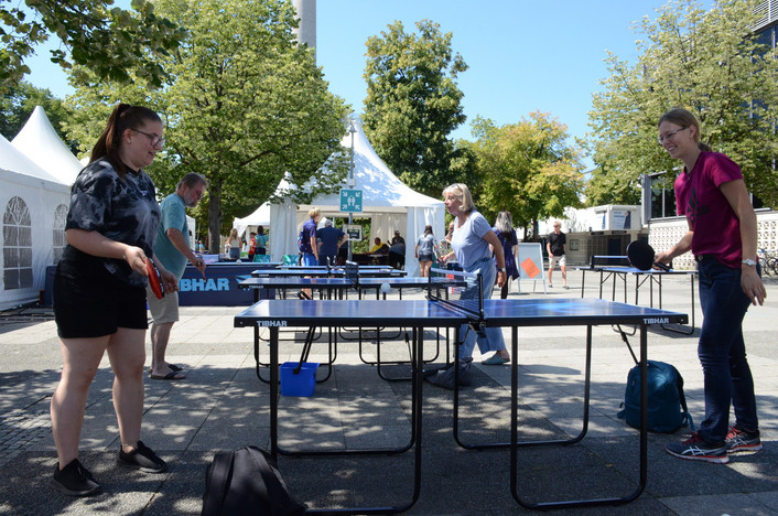 BTTV-Mitarbeiterin Petra Scherer ist ganz in ihrem Element und gibt Anweisungen. „Nach vorne schauen“, rät sie. „Wer den Ball nicht trifft, muss mir einen Kaffee spendieren“, frotzelt Scherer. Auch ein Sechsjähriger versucht sich am Tischtennis-Roboter.