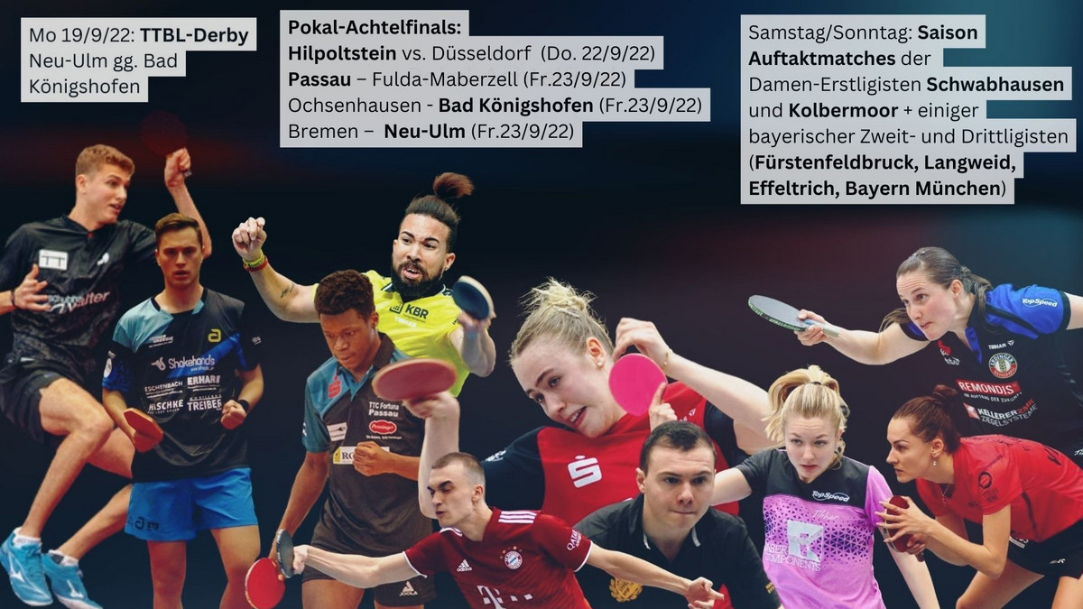 Tischtennisherz, was willst du mehr?! Bundesligen und Herren-Pokal bescheren TT-Bayern in Kalenderwoche 38 ein Schmankerl nach dem anderen. Zum Auftakt gibt’s am heutigen Montag (Spielbeginn 19 Uhr) das TTBL-Derby zwischen dem schwäbischen „Start-Up“ TTC Neu-Ulm und dem dem gewachsenen, unterfränkischen „Familienbetrieb“ TSV Bad Königshofen. Beide Teams gehen mit Rückenwind in die Begegnung: Bad Königshofen landete zuletzt ein 3:2 (nach 0:2) über Grünwettersbach. Durch den ersten Sieg im dritten Spiel ist die anfängliche Tristesse neuer Euphorie gewichen. Für Neu-Ulm läuft bislang sowieso alles nach Plan: In der TTBL ist man mit 4:2 Punkten im Plus und in der beim TTC Priorität genießenden europäischen Champions League hat man in Star-Besetzung mühelos die 2. Gruppenphase erreicht: Dimitrij Ovtcharov, Truls Moregard und Lin Yun-Ju schlugen hier für Neu-Ulm auf. Letzterer sollte nach einem Bericht der Augsburger Allgemeinen Zeitung auch im Bayernderby gegen Bad Königshofen zum Einsatz kommen, doch weil der Taiwaner gestern noch im Finale des WTT-Turniers in Kasachstans Hauptstadt Almaty stand, kann er vermutlich nicht rechtzeitig anreisen. Truls Moregard ist die wahrscheinliche Ersatzlösung. Schon die Aufstellung wird also spannend.