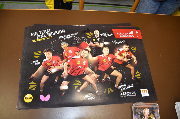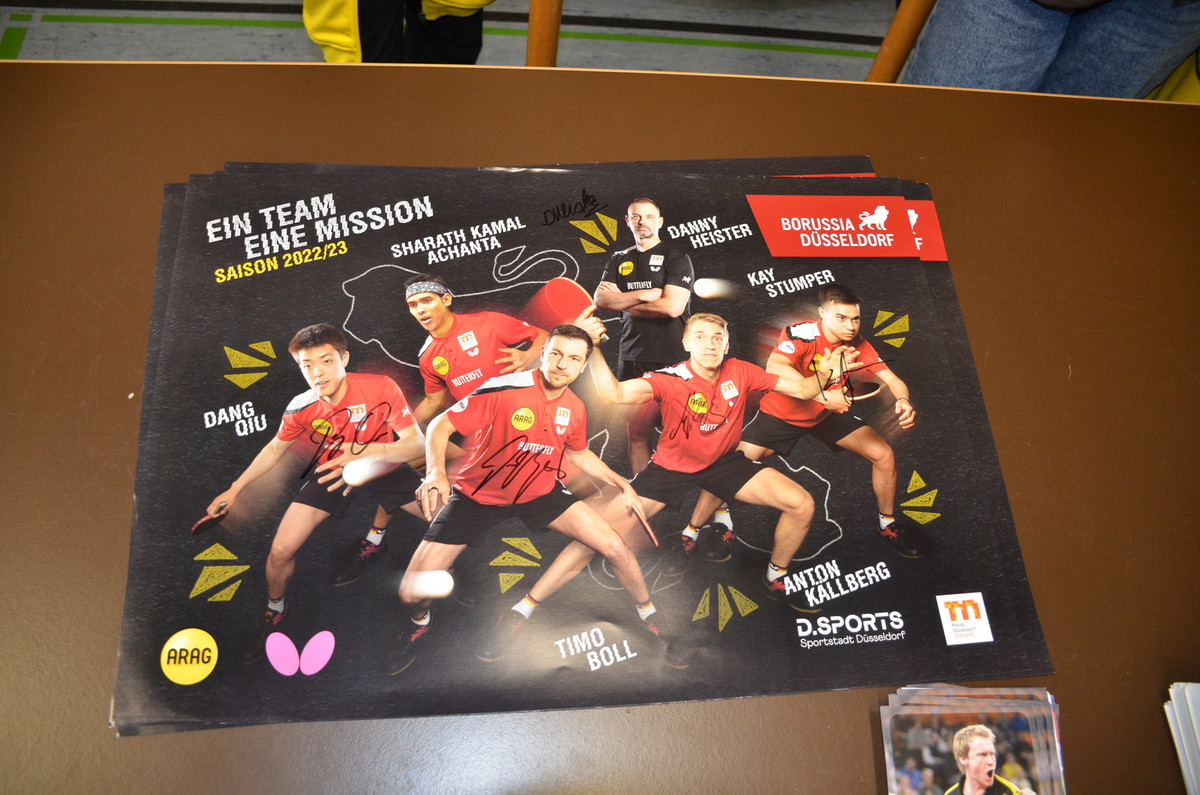 Viel Vorsicht: Weil in Kürze die Team-WM in China ansteht, bat der Hallensprecher die Fans, die Spieler von Borussia Düsseldorf nicht auf Autogramme anzusprechen. Teilweise saßen die Gästespieler auch mit Maske auf den Stühlen am Spielfeldrand. Doch die Fans mussten nicht ohne Unterschriften nach Hause gehen. An einem Stand konnten sie sich kostenlos ein Plakat mit allen Unterschriften abholen – nebst Autogrammkarten der TVH-Spieler.