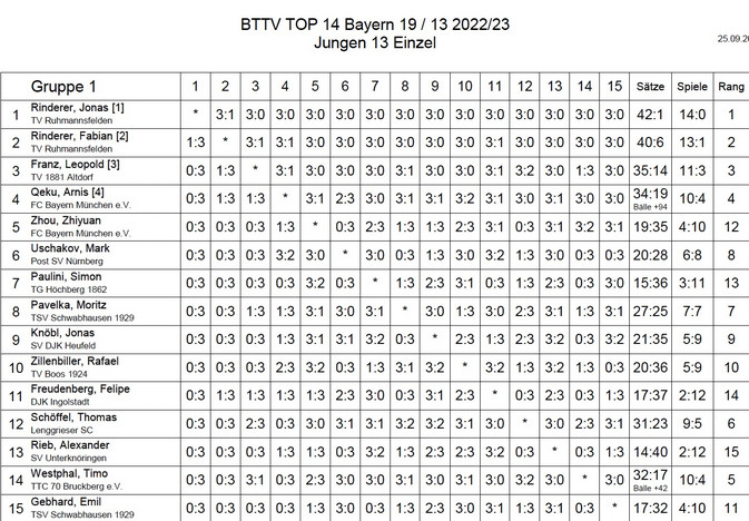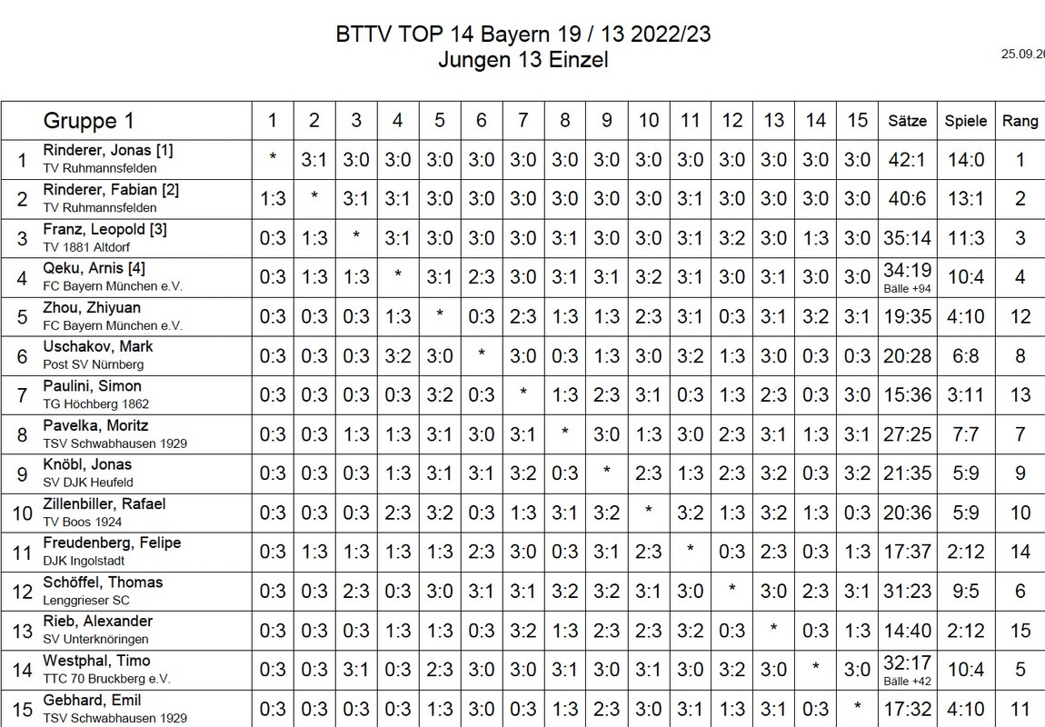 Knappe Entscheidungen gab`s dieses Wochenende beim BTTV Top 14 Bayern der Nachwuchsklassen Jungen 13 und 19 im niederbayerischen Arnstorf. Außer bei den Jungen 13, wo sich Jonas Rinderer (TV Ruhmannsfelden) nach seinem Triumph vor einer Woche bei den Jungen 15 ungeschlagen vor seinem Zwillingsbruder Fabian und Leopold Franz (DJK Altdorf) platzierte, musste überall das Satzverhältnis über den Turniersieg entscheiden.