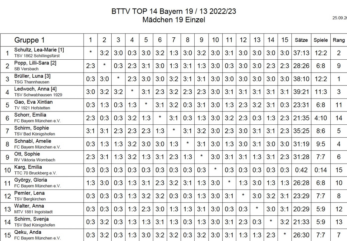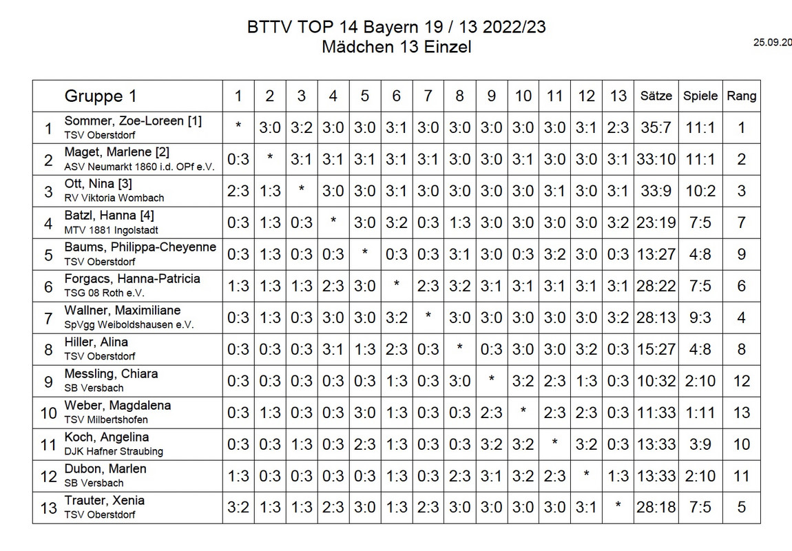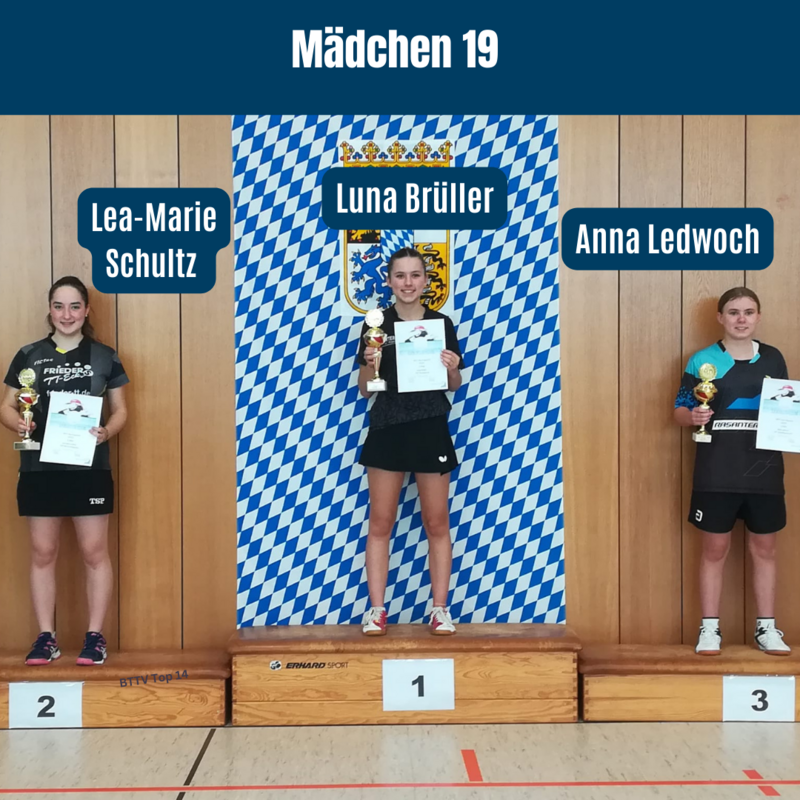 Bei den Mädchen 19 reichte Luna Brüller eine Bilanz von 12:2-Siegen zu „Gold“ vor ihrer spielgleichen LZ-Kollegin Lea-Marie Schultz (TSV 1862 Schillingsfürst) und Anna Ledwoch (TSV Schwabhausen). An Zoe-Loreen Sommer (TSV Oberstdorf) ging der Siegerpokal bei den Mädchen 13, spielgleich mit 11:1, aber drei Sätze schlechter holte sich Marlene Maget (ASV Neumarkt) Platz zwei vor Nina Ott (RV Viktoria Wombach).