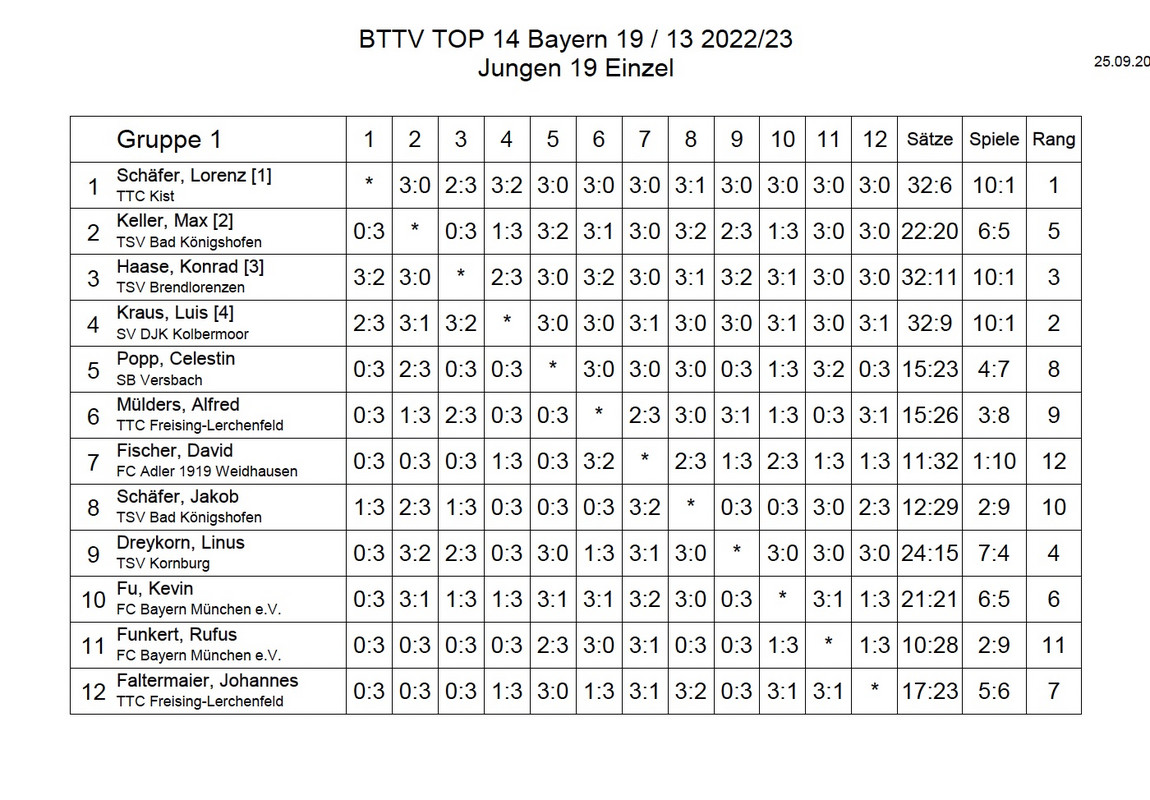In der Endabrechnung der Jungen 19 hatten gleich drei Spieler - allesamt Mitglieder des BTTV Leistungszentrums („LZ“) in München - 10:1-Siege zu Buche stehen: Die höchste Differenz von gewonnen gegenüber verlorenen Sätzen brachte Lorenz Schäfer (TTC Kist) den ersten Platz ein. Luis Kraus (SV DJK Kolbermoor), der im Herren-Teamsport zusammen mit Schäfer beim TTC Kist in der Regionalliga aufschlägt, wurde Zweiter vor Linkshänder Konrad Haase (TSV Brendlorenzen).