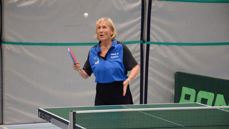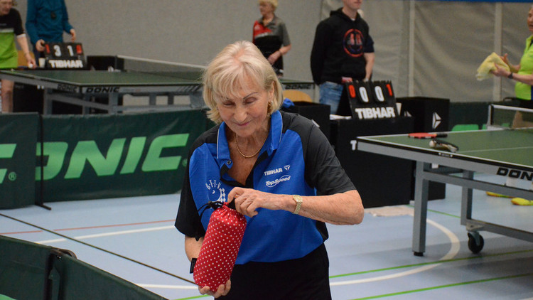 Die 79-Jährige strahlte deshalb über beide Backen. „Dass sich erstmals Deutsche Meisterin im Einzel geworden bin, ist nicht schlecht“, sagte sie bescheiden. „Gegen Eichhorn lag ich im ersten Satz 0:8 zurück und dachte mir schon: Um Gottes Willen, hoffentlich keine Nullrunde.“ So kam es dann nicht, es sollten noch vier Punkte folgen. „Im Mixed und Doppel bin ich gegen die späteren Deutschen Meister ausgeschieden“, nahm Berg das Ausscheiden gelassen hin.