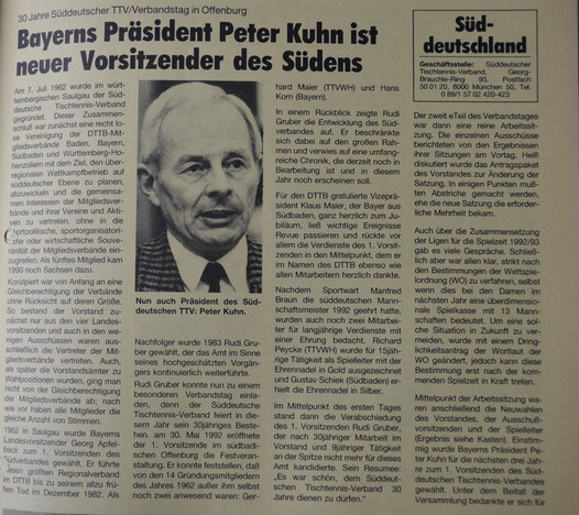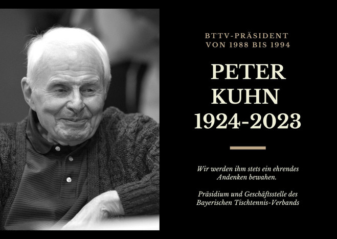 Ein ganz Großer des Tischtennissports ist von uns gegangen, der sich um den Bayerischen Tischtennis-Verband außerordentlich verdient gemacht hat. Wie bereits berichtet ist BTTV-Ehrenpräsident Peter Kuhn, früherer BTTV-Präsident (1988 bis 1994), vor wenigen Tagen im Alter von 98 Jahren gestorben.