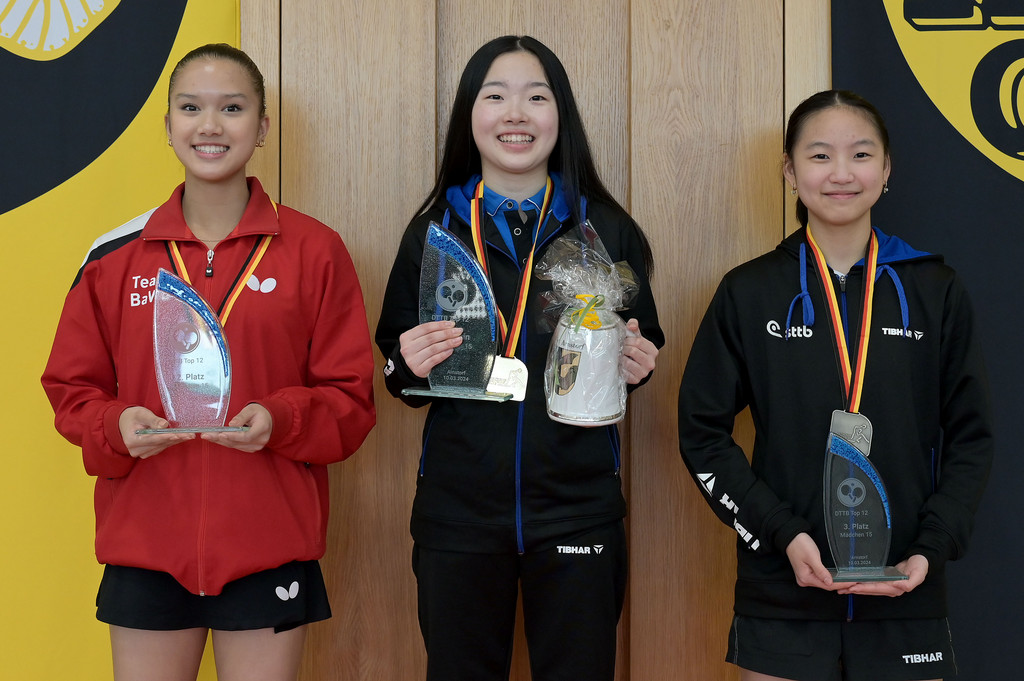 Stark! Bayerns TT-Nachwuchs hat sich beim Top 12-Bundesranglistenturnier im niederbayerischen Arnstorf in rein sportlicher Hinsicht als „knausriger“ Gastgeber gezeigt und zwei von vier Titeln einfach selber „einbehalten“: Ohne Satzverlust (!) sicherte sich Koharu Itagaki (TSV Bad Königshofen) den Turniersieg bei den Mädchen 15 und Jonas Rinderer (TV Ruhmannsfelden) gewann trotz widriger Umstände dank einer enormen Energie- und Willensleistung die Konkurrenz der Jungen 15. Nach einem makellosen ersten Turniertag sorgten plötzliche Magen-Darm-Probleme für eine schlaflose Nacht auf Sonntag; Rinderers Weiterspielen stand auf der Kippe, doch er wollte es trotz anhaltender gesundheitlich Probleme probieren und wurde dafür belohnt. Für weitere bayerische Medaillen sorgten Melanie Merk (TSV Dachau) und Olha Ponko (FC Bayern München) als Zweite und Dritte bei den Mädchen 19. Als durchführender Verein verdiente sich der LAC Arnstorf höchste Meriten. Die Niederbayern um TT-Abteilungsleiter Stephan Strasser und dessen Vorgänger Willibald Bauer, der das Top 12 in seiner Amtszeit nach Arnstorf geholt hatte, rollten für die jungen Sportler sowohl im übertragenen als auch wörtlichen Sinne den roten Teppich aus. „Die Arnstorfer waren ein super Gastgeber: Eine schöne Halle mit großem Parkplatz, leckeres Essen, eine Top-Organisation und nicht zuletzt ein ganz, ganz liebevolles Helferteam“, fand unter anderem BTTV-Verbandstrainerin Krisztina Toth.