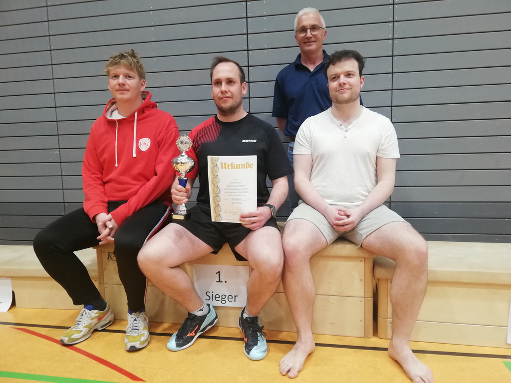 Bei den Herren ging es in der Bezirksliga eng zu. Der TB/ASV Regenstauf (Oberpfalz-Süd) gewann zwar alle drei Partien, jedoch jeweils mit 4:3. Gegen den TSV Karlstadt und TSV Gräfelfing V lag er jeweils 2:3 hinten, doch zweimal Friedrich Binder und Cornelius Ried (gegen Karlstadt) sowie Fabian Brandl (gegen Gräfelfing) drehten die Partie noch.