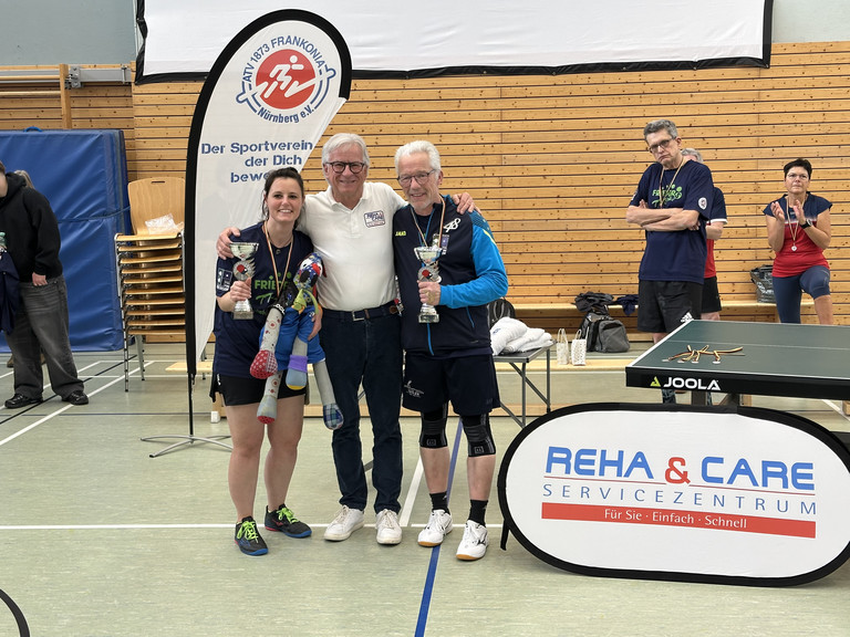 Die Idee entstand bereits 2023 während der WM in Wels. "Dort kam während einem Bierchen bei der Players-Night die Frage auf, warum es eigentlich kein Mixed-Turnier gibt", erzählt Trautner. "Es wollte jeoch keiner der Anwesenden so richtig in die Hand nehmen. Das Ganze schlummerte deshalb noch ein weiteres Jahr in meinem Kopf. Bis sich die Gelegenheit ergab, an einem Stützpunkt in Nürnberg ein Zeitfenster zu bekommen." Über den Vorsitzenden des ATV Frankonia sei durch Zufall der Kontakt zu Reha & Care entstanden. Als Friedrich Gröger von Frieders TT-Eck (Ansbach) davon erfuhr, erklärte sich dieser bereit, einheitliche Trikots zu spendieren.
