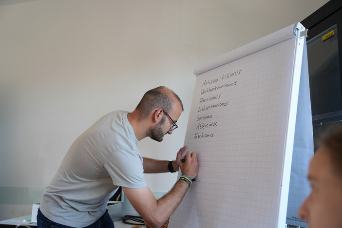 Und doch zeigte sich, dass der Verein auch ein Ort sein kann, wo durchaus Begriffe wie Diskriminierung und Extremismus eine Rolle spielen können. In einer Übung mussten sich die Teilnehmenden positionieren, ob sie einer getätigten Aussage vollkommen zustimmen oder gänzlich nicht oder ob man unentschieden ist. Dementsprechend musste man über eine Linie treten, zurückgehen oder stehenbleiben und am Ende den eigenen Gedanken erklären. Ein Satz lautete zum Beispiel: „Es ist nur ein Witz, wenn jemand Witze über andere Kulturen macht."
