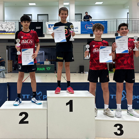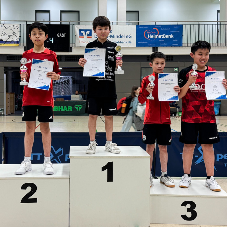 Jede Menge Talent und Spielfreude bot das Finale der Jungen 13: Willy Haas (TTC Kist) und Bohan Xiao (FC Bayern München) lieferten sich ein packendes Duell, in dem sich schließlich die an diesem Tag größere Schlagsicherheit und Unbekümmertheit des ein Jahr jüngeren Linkshänders Haas durchsetzte. Xiao konnte sich mit Doppel-Gold (mit Louis Schulze) und Mixed-Gold (mit Marie Lendroit) trösten. Einzel-Bronze holten Didi He (MTV Ingolstadt) und Felix Zhang (FC Bayern München).