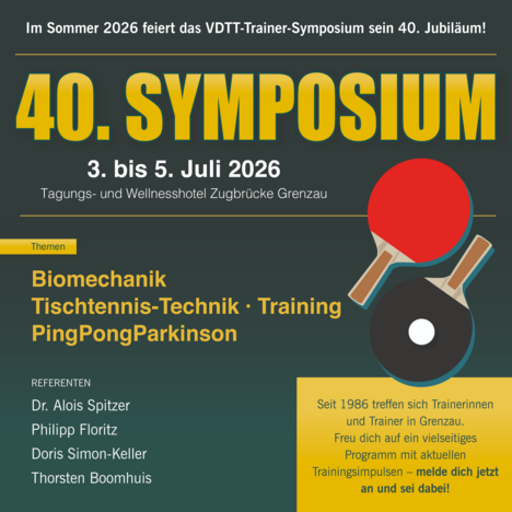 Das 40. VDTT-Trainer-Symposium 2026 findet vom 3.–5. Juli 2026 im Wellness- und Tagungshotel Zugbrücke Grenzau statt. Als Jubiläumsausgabe stellt dieses Symposium einen besonderen Meilenstein in der Trainerbildung seit 1986 dar – gleichzeitig richtet sich der Blick aber auch nach vorn auf aktuelle Entwicklungen im Tischtennis.