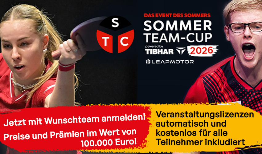 Nach großen Erfolgen in den vergangenen Jahren geht der Sommer-Team-Cup 2026 in seine sechste Austragung. Die myTischtennis GmbH, TIBHAR und der Deutsche Tischtennis-Bund geben Ihnen erneut die Möglichkeit, in der langen, punktspielfreien Zeit zur Vorbereitung auf die Saison 2026/2027 Wettkämpfe mit TTR-Relevanz zu bestreiten.