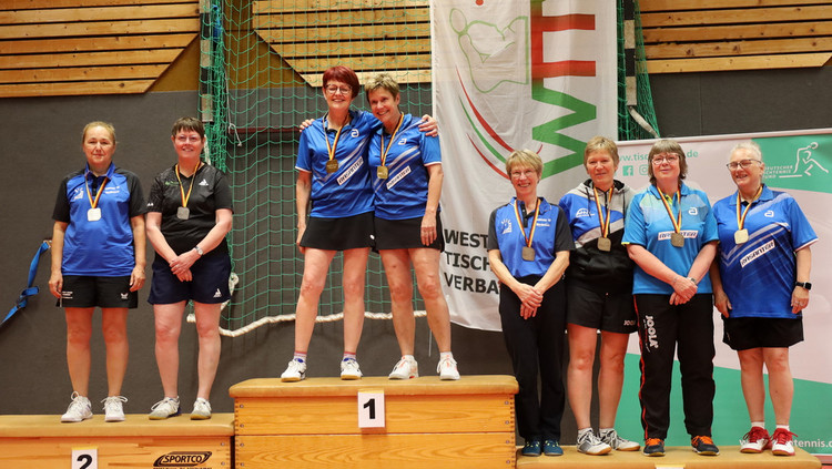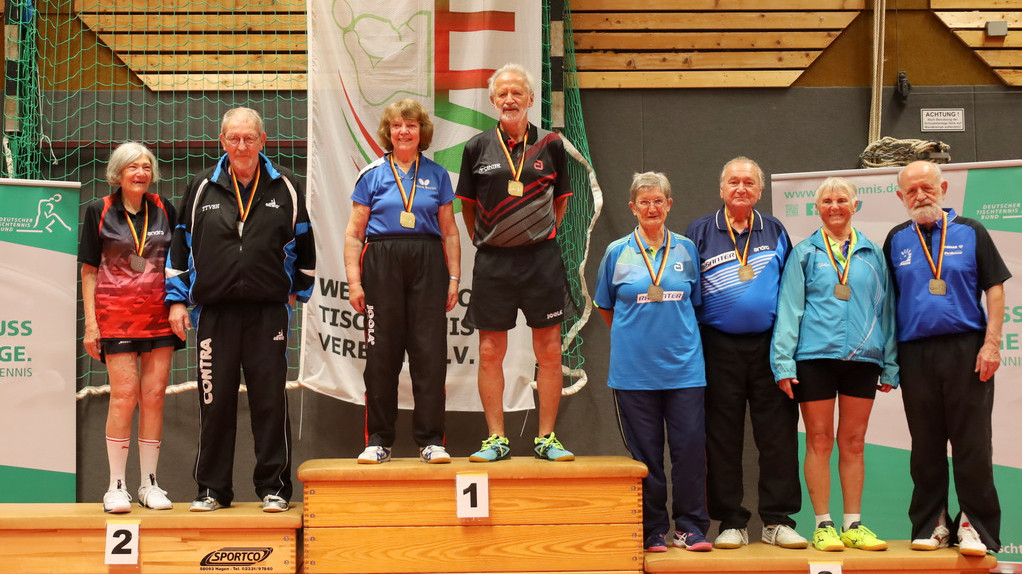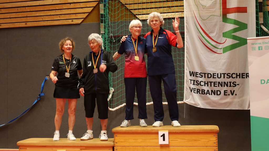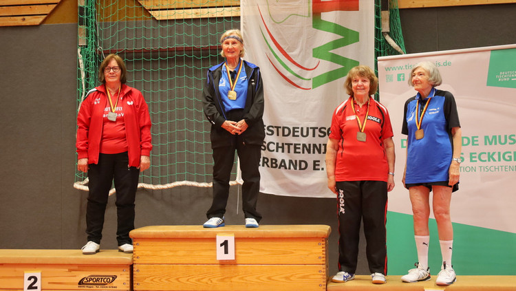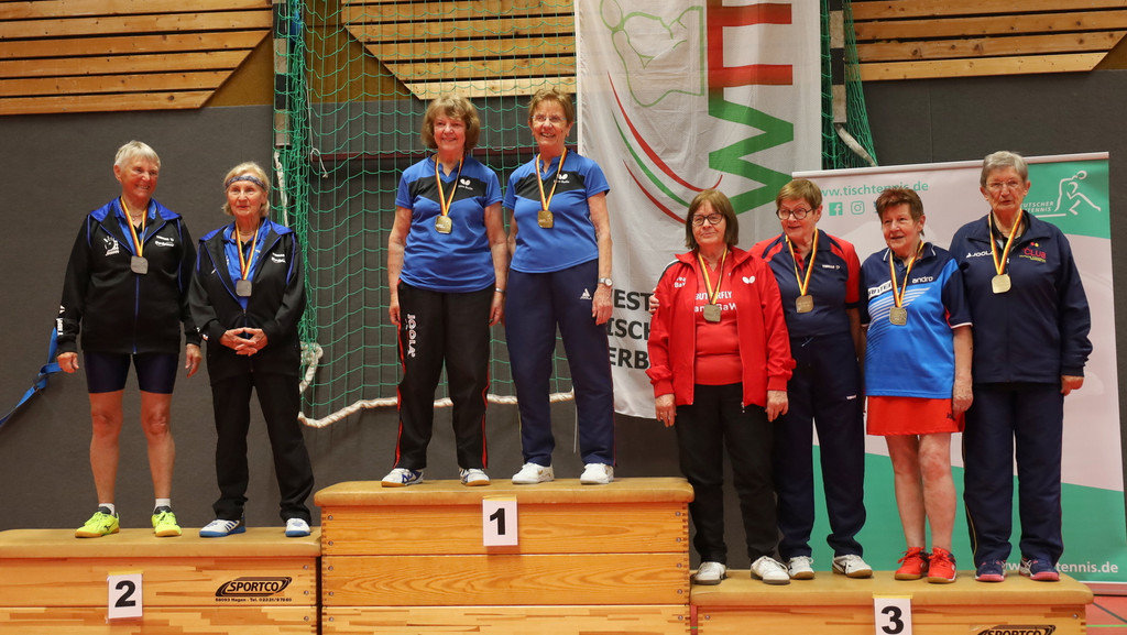 Nach Gold im Einzel erweiterte Dietrich bei den Seniorinnen 60 ihren Medaillensatz mit Silber im Doppel. Mit Marion Hillmer (Post SV Uelzen) musste sie sich nur Annette Schimmelpfennig/Maria Beltermann 1:3 (10:12, 11:6, 8:11, 6:11) geschlagen geben. Zuvor waren mit dem gleichen Ergebnis schon Karen Hellwig (SV Eurasburg-Beuerberg)/Cornelia Bienstadt (TTC Langen) an ihnen gescheitert, durften sich aber mit Bronze trösten.