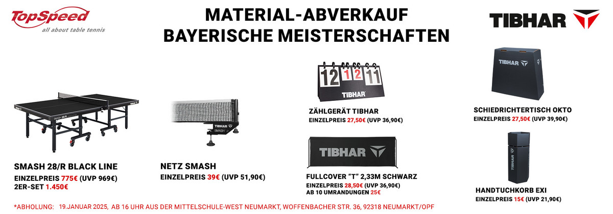 Die Bayerischen Meister stehen am Sonntag, 19. Januar, fest. Am gleichen Tag können auch die Materialien der BEM aus Neumarkt abgeholt werden. Der Bayerische Tischtennis-Verband veranstaltet mit seinem Durchführerverein ASV Neumarkt und seinem Ausrüster TIBHAR die 77. Auflage der Landesmeisterschaften erneut "in schwarz", d.h. es kommen schwarze Tische und schwarze Umrandungen (zusätzlich zu den schwarzen SR-Tischen) zum Einsatz - und diese werden direkt nach dem Turnier abverkauft.
