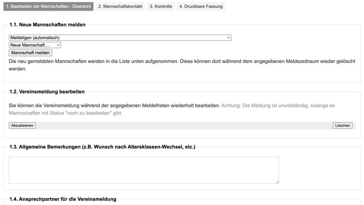 Das Meldeverfahren bzw. die Eingabemaske ist analog der Vereinsmeldung zum "normalen" Ligenpielbetrieb und kann über den Menüpunkt "Meldungen" aufgerufen werden.