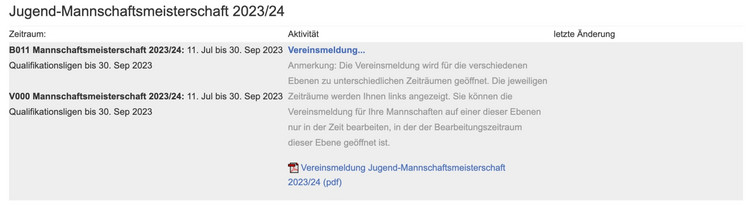 Das Meldefenster bleibt bis zum 30. September 2023 geöffnet. In diesem Zeitraum können neue Mannschaften gemeldet und später auch noch bearbeitet werden, sollte sich z.B. über die Sommerferien im Nachwuchsbereich des Vereins Änderungen ergeben.