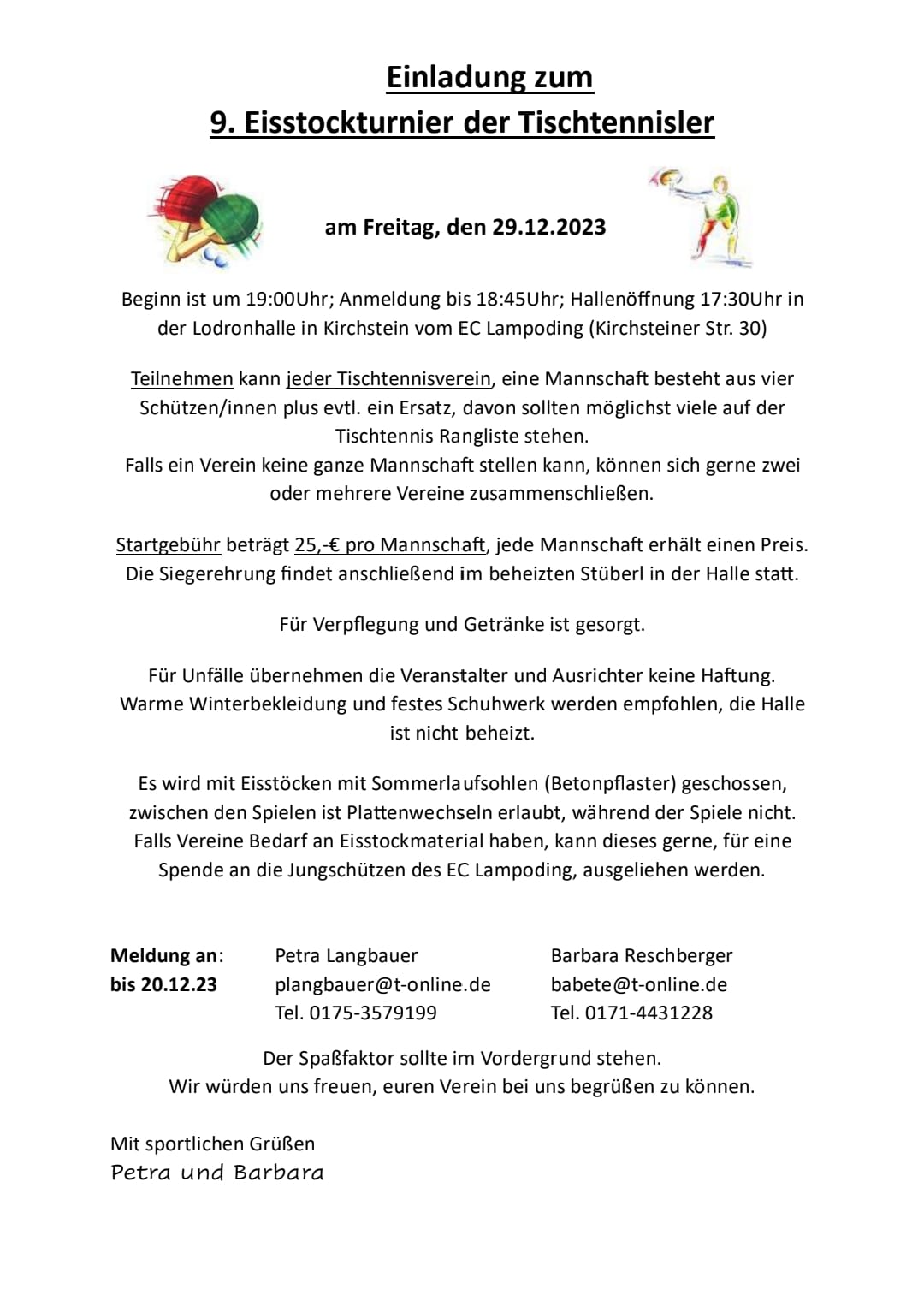 Barbara Reschberger und Petra Langbauer laden euch zum 9. Eisstockturnier der Tischtennisler ein.