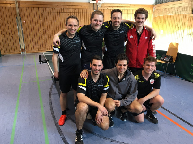 Bild: Christian Kreuzmair, Michael Neuberger, Tobias Brandl (stehend von links) und Alexander Christl (kniend links) gewannen mit dem SC Seeham das Final-Four beim TSV Finning. Aber der Finalgegner aus Königsdorf präsentierte sich mit Florian Würmseer (stehend), Peter Sonner und Hannes Würmseer (knieend von rechts) auf Augenhöhe.
