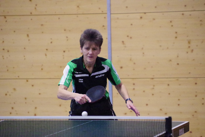 Gleich dreimal auf dem Podest, und dabei stets als Drittplatzierte, stand Juliane Dressel in der Altersklasse (AK) 65. Im Einzel hatte sie als Gruppenzweite die Endrunde erreicht. Hier traf sie im Viertelfinale auf ihre Vereinskameradin Irene Fieber, die sie mit 3:1 besiegte (11:7, 11:2, 9:11, 11:5). Im Halbfinale war ihre Gegnerin die spätere Gewinnerin Karen Hellwig vom SV Eurasburg, gegen der sie mit 5:11, 12:14 und 8:11 das Nachsehen hatte. Immerhin bedeutete dies noch „Bronze“, Fieber landet auf dem fünften Platz. Im Doppel bildeten Dressel und Fieber eine Einheit. Auch hier war im Halbfinale Endstation. Allerdings scheiterten die beiden Kulmbacherinnen gegen eine unter-/mittelfränkische Formation erst im fünften Satz (10:12, 12:10, 5:11, 12:10, 8:11). Der nächste dritte Rang folgte für Dressel im Mixed zusammen mit Günter Dietrich (SB Regensburg). Hier kam im Halbfinale das Aus gegen das anschließende niederbayerische Vizemeister-Duo.