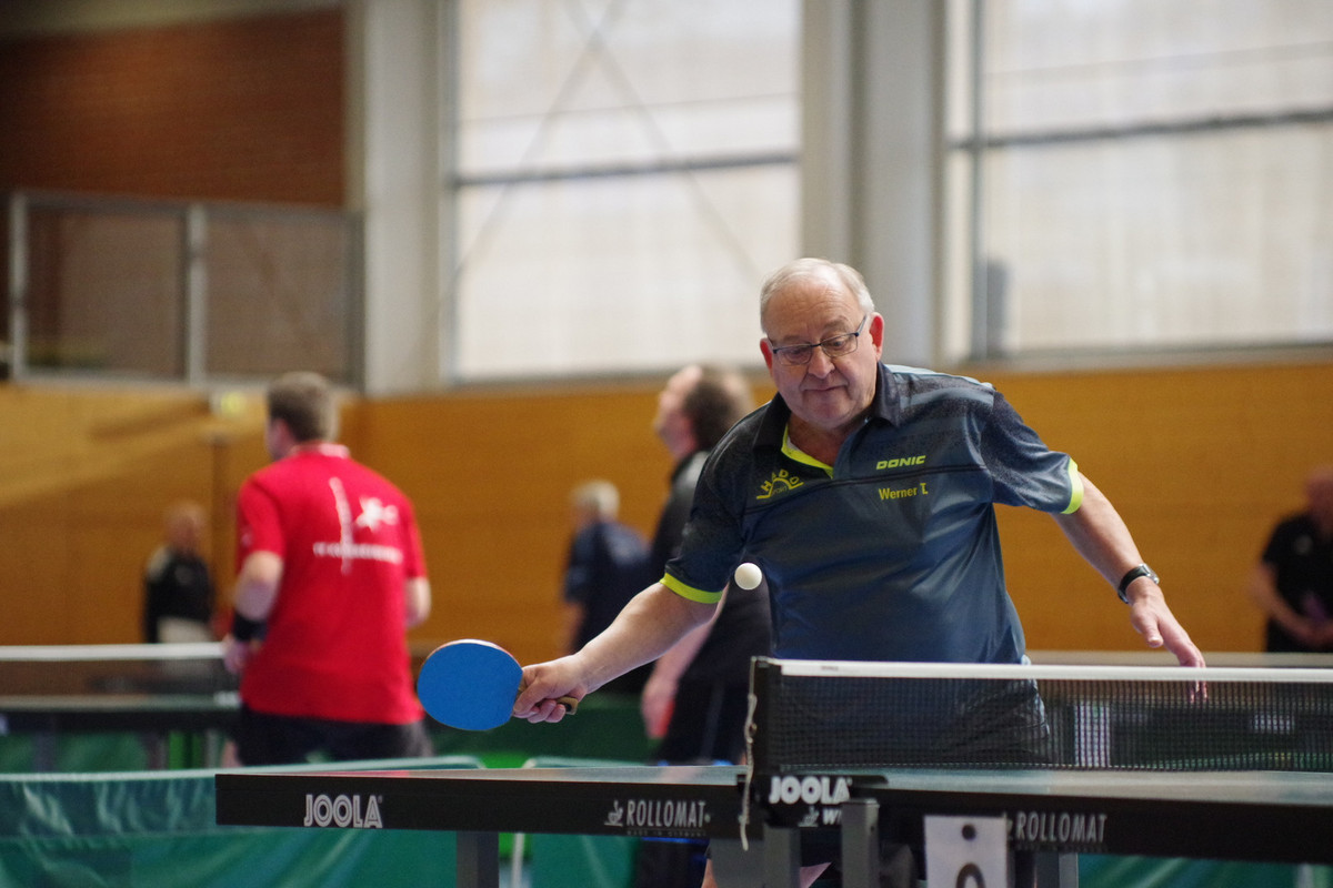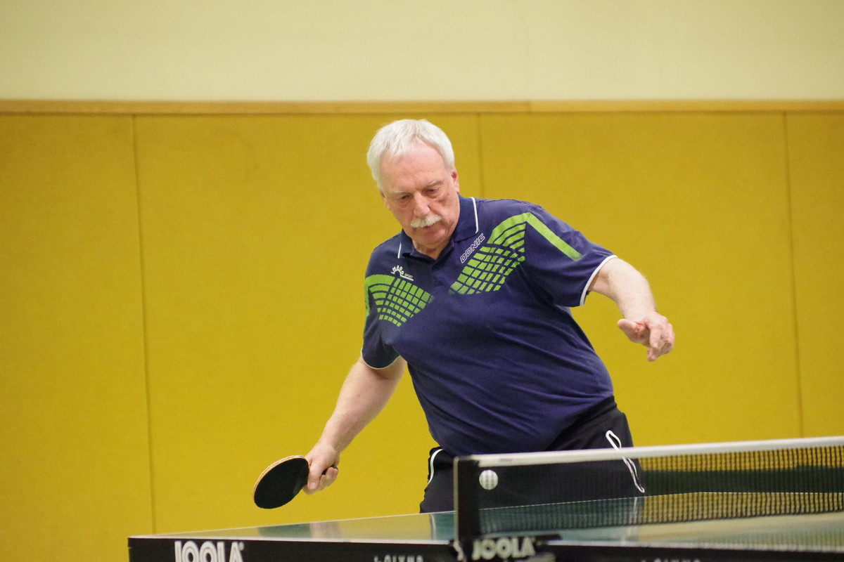In der AK 75 der Herren wurde das Endspiel zu einem Rugendorfer Vereinsduell, bei dem Michael Zrenner gegen Werner Türk ohne Satzverlust blieb (11:4, 11:9, 11:7). Zrenner hatte auch ohne Satzverlust seine Gruppenspiele abgeschlossen. Im späteren Viertel- und Halbfinale schaltete er zwei Kontrahenten vom TSV Dachau aus. Auch Werner Türk war Gruppensieger geworden, musste aber zweimal alles in die Waagschale werfen, um nach jeweiligen 0:2-Rückstand noch mit 3:2 die Oberhand zu behalten. Nachdem er im Viertelfinale gegen Hofmann vom FC Eschenau mit 3:0 aufgetrumpft hatte, musste er im Halbfinale nochmals über die volle Distanz von fünf Durchgängen. Dabei hielt er Hans Eitel (FC Thüngen) nach 1:2-Rückstand noch mit einem 11:7 und 11:8 nieder. Das Finale bedeutete Gold und Silber für die beiden Akteure des TTC Rugendorf. hf / Hans Franz