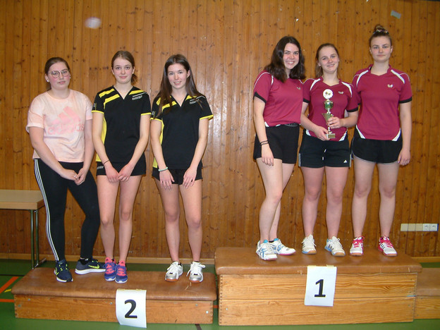 Die Mädchen des TSV Unterlauter sicherten sich mit einem knappen 4:3-Erfolg über den TTC Rödental den westoberfränkischen Pokalsieg der Verbandsliga-Mannschaften. Unser Bild zeigt das erfolgreiche Team mit (von rechts) Ronja Hoyer, Lea Behnsch und Anne Lüer. Mit im Bild der TTC Rödental (von links) mit Linnea Reumschüssel, Antonia Burlyeav und Nina Steckmann.