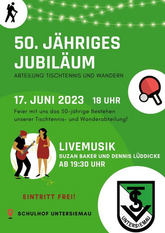 Der TSV Untersiemau feiert am Samstag, 17. Juni, das 50-jährige Bestehen seiner Tischtennis- und Wanderabteilung. Ab 19.30 Uhr kann, als "Saisonvorbereitung" bei Livemusik das Tanzbein geschwungen werden!
