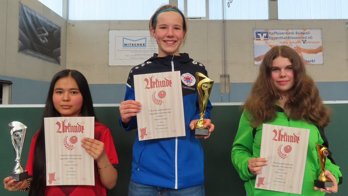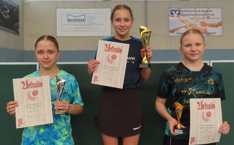 Bei den Mädchen 13 sorgten Annika Settele und Feline Reuter für einen Doppelsieg der Lokalmatadoren der SG Eggenthal-Baisweil. Sie kamen vor Mia Noll (SG Dösingen) über die Ziellinie. Das Feld der Mädchen 15 wurde von Marie Düvel (TSV Leuterschach) beherrscht. Sie siegte vor Najmeh Rezai (SV Dettingen) und Annika Remer (TSV Marktoberdorf).