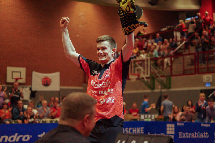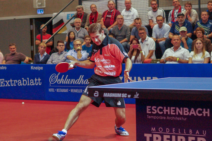 Lampenfieber ließ er nicht („zumindest nicht nach außen“ - O-Ton Vater Hans Steger) erkennen. Als Nummer 1 ging er gleich zum ersten Spiel an den Tisch gegen den Zweier von Grenzau, Mihail-Razvan Bobocica. Spätestens jetzt war jedwede aktuelle Weltranglisten-Statistik vom Tisch. Nach dieser wäre Königshofen eh krasser Außenseiter gewesen, Steger nur statistisch mit dem Italiener auf Augenhöhe. Doch „Basti“ gewann den ersten Punkt, den ersten Satz, wenn auch knapp, und am Ende sein erstes Spiel mit entwaffnender Überlegenheit. Jetzt konnte er diese Huldigungen des Publikums selber so genießen, wie er es die letzten zwei Auftritte hier im Trikot des SV Werder Bremen noch neidvoll als „bestes Publikum in der TTBL“ mitbekommen hatte. Jetzt gehörte ihm, dem Olympia-, WM- und EM-Medaillen-Gewinner, dieses Publikum. Und mitten drin Papa Hans und Mama Gerti aus der Oberpfalz. Nach 20 Jahren bei vier verschiedenen deutschen Spitzenclubs war ihr „Bou dahoam“ angekommen.