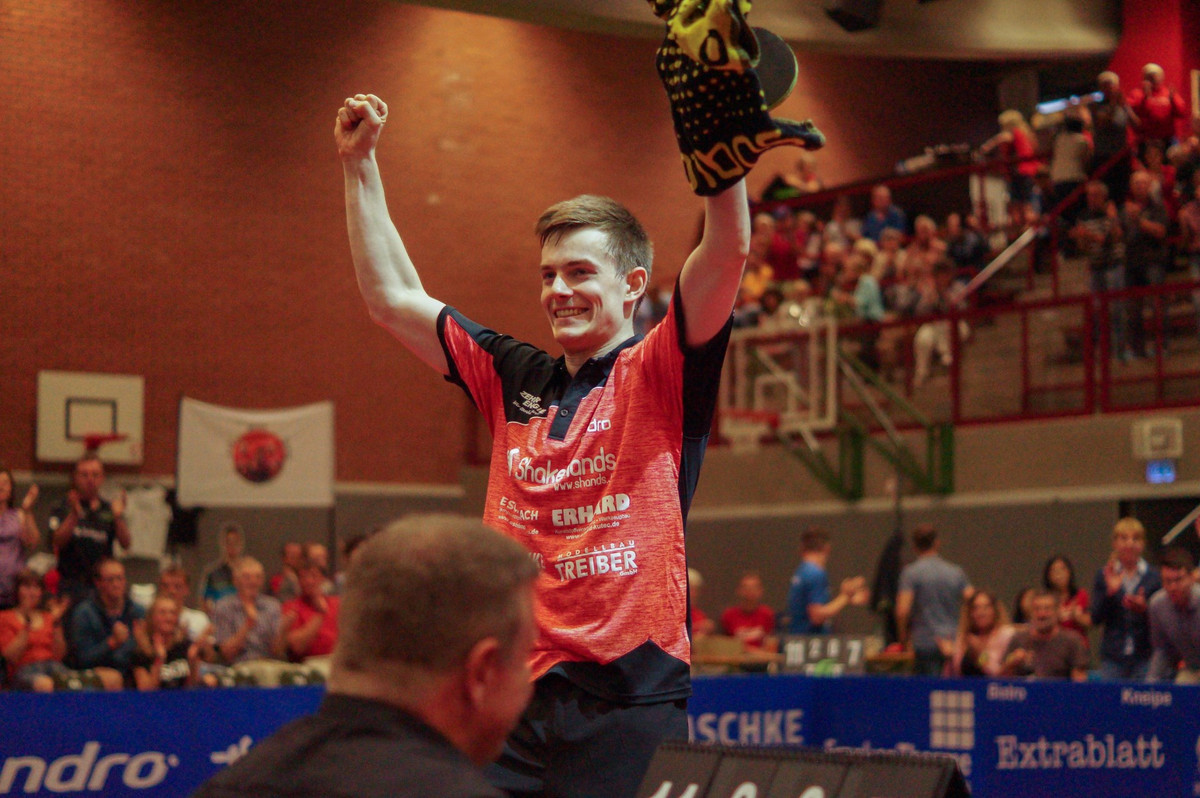 Der echte Sohn der Stadt, Kilian Ort, nur 300 Meter von der Halle entfernt aufgewachsen, musste/durfte dann gegen den neuen Grenzauer Einser Kanak Jha, mit 16 schon Olympiateilnehmer für die USA in Rio, ran. Der Shooting Star ist mit seinen 18 Jahren in seinem Flow bereits auf 33 in der Weltrangliste zwischengelandet. Aber gegen Kilian Ort, WR 215, sah er kein Land. Doch was war denn das für ein erster Satz! Nach 0:2 zog Ort auf 9:2 und 10:4 davon. Dieses eine Pünktchen würde schon noch irgendwie rüber purzeln. Doch die Zitterpartie gipfelte im 10:11 für Jha. Zum 11:11 setzte „Killy“ voll auf Risiko nach dem Motto „Frechheit siegt“. Den Aufschlag des Amerikaners returnierte er mit rotzfrecher Vorhandpeitsche unerreichbar zurück. Mit dem siebten Satzball beendete er den Thriller zur 1:0-Führung.