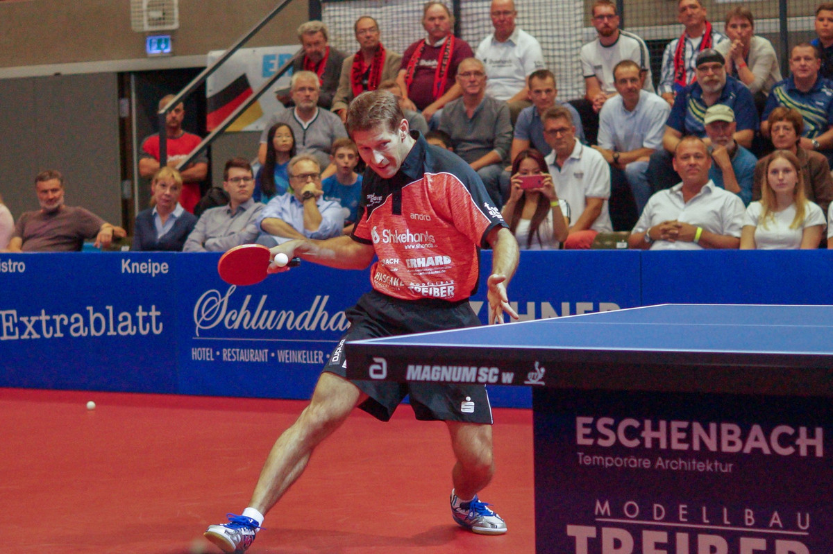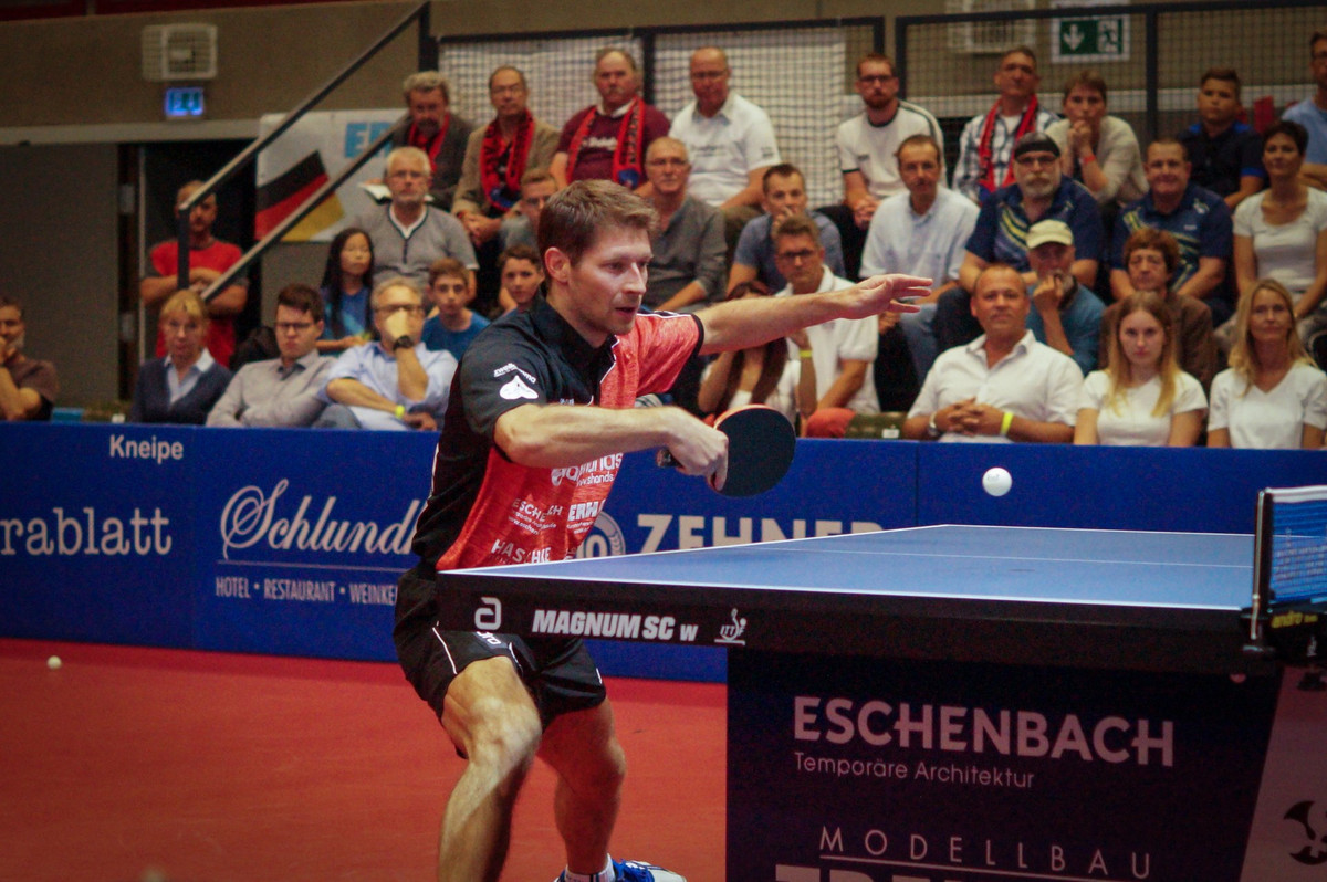 Wer weiß, wie Kilian Ort psychisch konditioniert ist, kennt sein Credo zum Saisonauftakt („Der ist ungeheuer wichtig für die ganze Runde“) und den Wert eines Siegs gegen eine Nummer 33 der Welt für sein Selbstvertrauen. Auch den zweiten Satz zog er eiskalt wie eine Hundeschnauze durch, über 10:4 zum 11:7. Beim Schlagabtausch zum 8:3 aber bekam der Ball ´ne Gänsehaut: Erst schlugen sie ihn sich mit langer Rallye gegenseitig um die Ohren. Dann kippte das Runde über das Gespannte, das Netz, zu Ort herüber auf die Tischkante, dann unter den Netzpfosten, fast auf den Boden. Wie von der Tarantel gestochen tauchte Kilian Ort ab und baggerte ihn an Pfosten und Netz vorbei auf die Jha´sche Seite zurück, holte selbst diesen Punkt. Mit dem 11:7 im dritten Satz hatte er aus der (für ihn) „Opfer-Rolle“, gegen den Einser, das Beste gemacht, einen Sieg.