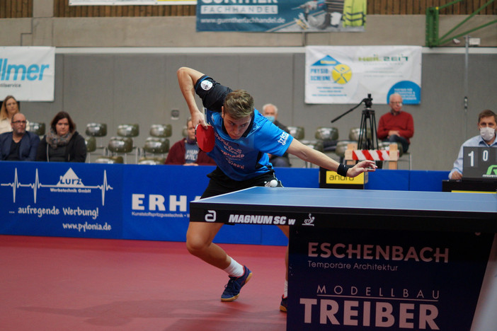 Was also hatte Filip Zeljko gegen den Neu-Ulmer Einser Emmanuel Lebesson, den Einzel-Europameister von 2016, die Nr. 41 der Weltrangliste, zu bieten? Zeljko an 2, natürlich steckte dahinter auch taktisches Kalkül. Rechnen durfte man mit einem Sieg natürlich nicht. Doch wer von den Fans zum Einschlafen am Abend noch ein paar schöne Gedanken an den Tag haben wollte, Filip lieferte sie. Im ersten Satz spielte er voll auf Augenhöhe, unterlag 11:13. Der alte Fuchs (32) hatte vor dem Jungfuchs (22) die Nase vorn. Lebesson war klar der Bessere im zweiten Satz (4:11). Dritter Satz: 11:8 für den höchst impulsiven Mentalität-Spieler Zeljko. Vermuteter Ehrensatz. Von wegen! Da war ja noch das Publikum, das Zeljko mit ins Boot holte. Nach der Melodie von Queens „We will, we will rock you“ feuerte es ihn unermüdlich mit „Filip, Filip Zeljko“ an, wie in besten Vor-Corona-Zeiten. Ja wirklich: Der gute Filip ließ viele in der Halle und daheim am Bildschirm die Bedrängnisse dieser Zeit vergessen. Die Emotionen der Fans waren Injektionen in seine Blutbahn, Dauerinfusionen, erlaubtes Doping.