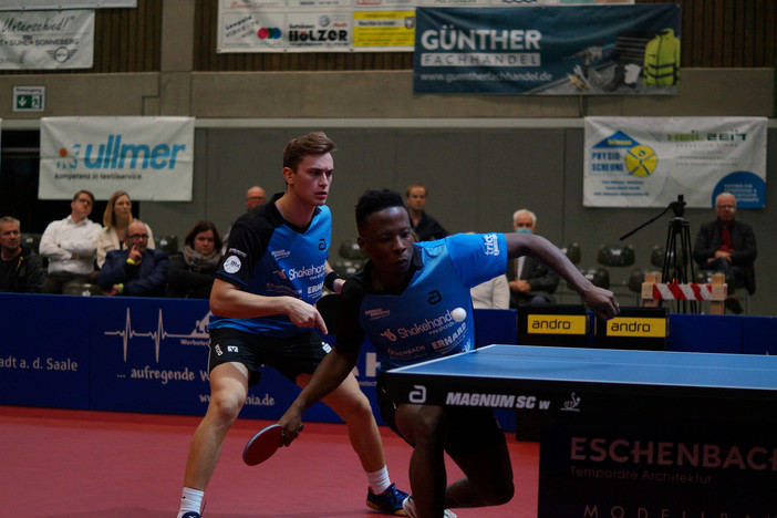 Und wenn gestern Abend um viertel sieben alle Fenster und Türen der Shakehands-Arena sperrangelweit offen gestanden hätten: Gefroren hätte niemand bei diesem alles entscheidenden Schlussdoppel, das der an diesem Tag überragende Filip Zeljko und Abdel Salifou gegen die Neu-Ulmer Rechts-Linkshänder-Kombination Apolonia/Sidorenko im fünften Satz mit 10:12 verloren. Da war der Tischtennis-Gott ein Schwabe. Das Königshöfer Duo, das noch nie in einem Wettkampf zusammen gespielt hatte, entschied die ersten beiden Sätze nach Rückständen mit 11:9 und 12:10 für sich, verlor den dritten 7:11 und war im vierten bei 10:10 zwei Bällchen vom Sieg entfernt (10:12) und im fünften bei 10:10 wieder. Zeljko hatte Salifou zu einem soliden Doppel mit hoch gezogen, Apolonia in Sidorenko den besseren Partner neben sich. Den Rück-Schlag zum Match-Verlust zitterte der Königshöfer Neuzugang mit schwerer Hand ins Netz – und es wurde für einige Momente mucksmäuschenstill in der Halle. Eine völlig neue Reaktion: Die 120 Zuschauer hatten es noch nicht verkraftet, Filip und Abdel hatten die Köpfe unten, und die Neu-Ulmer zeigten eine im großen Sport nicht alltägliche, ritterliche Zurückhaltung. Sie wussten, dass sie eine halbe Minute vorher selber noch irgendwo zwischen Himmel und Hölle gehangen haben.