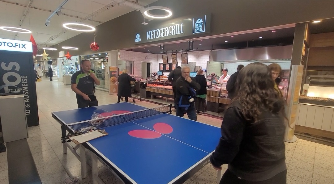 Neben Stopps bei Schulen und Kindergärten gab es heute auch einen ausgefallenen Ort für eine Mitgliederwerbeaktion. Die Tische und der Tischtennis-Roboter standen nämlich in einem Einkaufszentrum – und zwar bei Globus in Schwandorf (Oberpfalz-Nord).