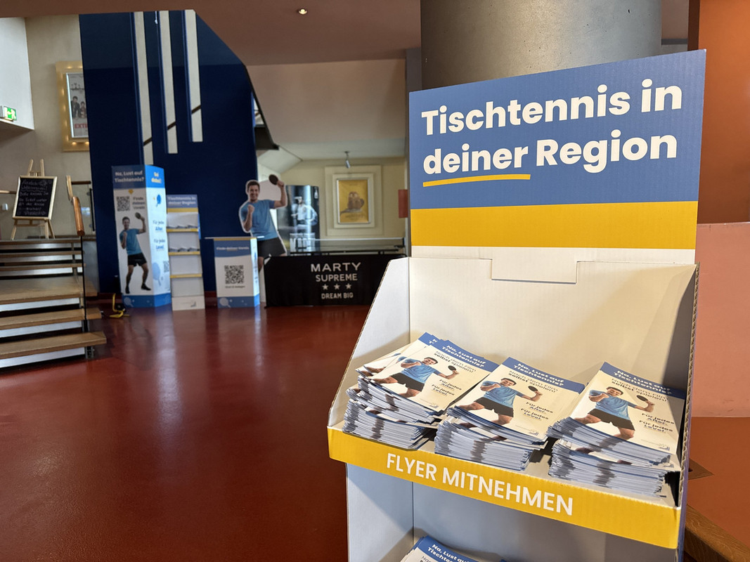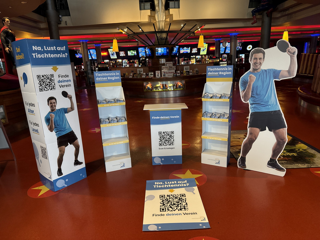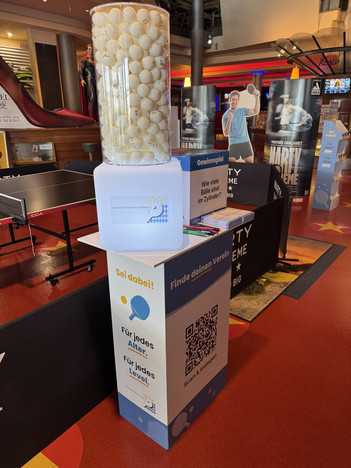Im Foyer erwartete die Gäste eine kleine Aktionsfläche mit Informationen zu den Tischtennisvereinen in der Region. Ein lebensgroßer Spieler-Aufsteller, eine Aktions-Theke mit QR-Code zur Vereinsübersicht sowie ein Gewinnspiel rund um eine Plexiglassäule voller Tischtennisbälle sorgten für Aufmerksamkeit und viele neugierige Blicke.